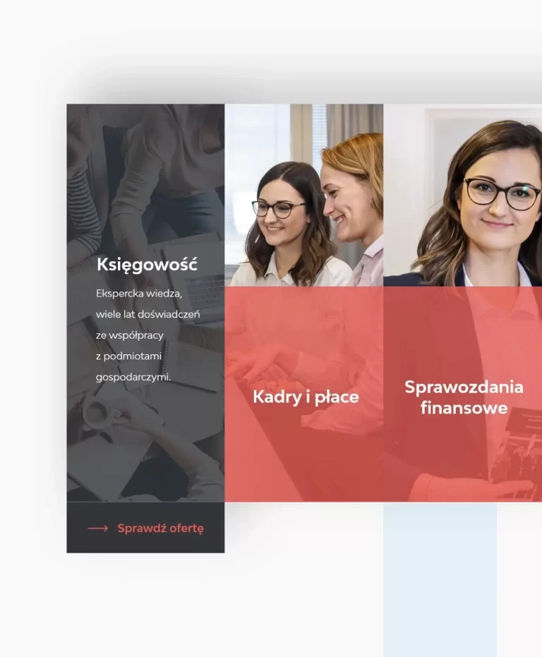 Podstrona z ofertą usług księgowych jest kluczowym elementem konwersji. Połączyliśmy użyteczność z estetycznym designem. Najechaniu kursorem na etykietę z nazwą usługi, rozwija się ona, prezentując skrócony opis zachęcający do kliknięcia i zapoznania się ze szczegółami.