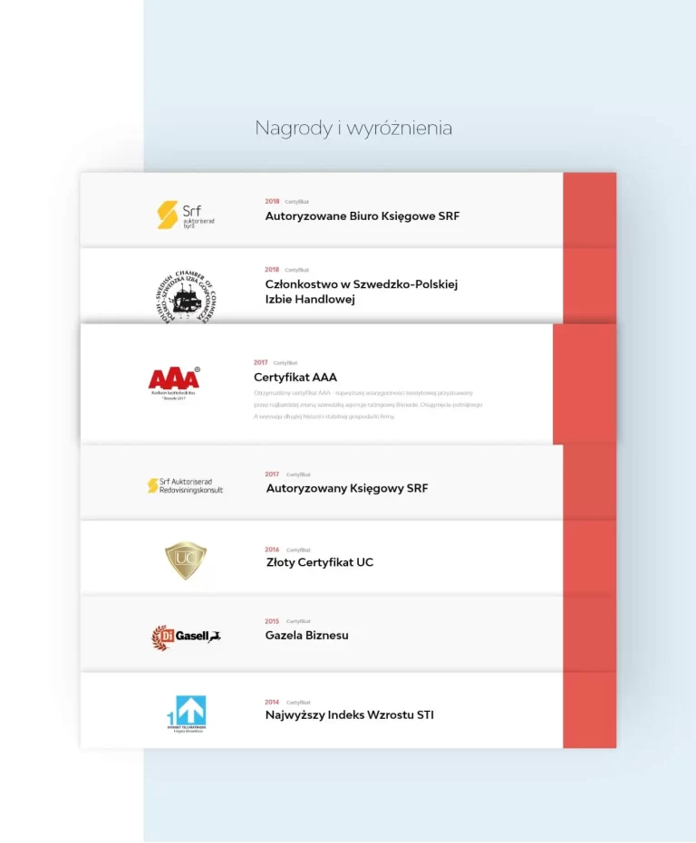 Podstrona “Wyróżnienia” prezentuje nagrody i certyfikaty, budując wiarygodność i pozycję eksperta w branży. Na górze znajdują się najważniejsze certyfikaty i autoryzacje, a poniżej interaktywna galeria osiągnięć. Po najechaniu kursorem na panel, pojawiają się dodatkowe informacje o wyróżnieniu.