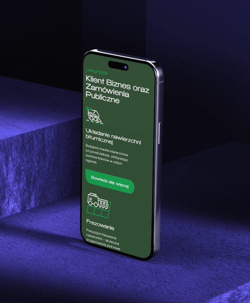 Projektując strukturę menu, postawiliśmy na maksymalną czytelność i prostotę. Główne sekcje serwisu – oferta, realizacje, o firmie, kontakt – są zawsze łatwo dostępne z każdego miejsca na stronie. Jasny podział pozwala szybko przejść do interesujących treści, niezależnie od tego, czy użytkownik szuka szczegółów dotyczących usług drogowych, inspiracji w galerii realizacji, czy chce dowiedzieć się więcej o doświadczeniu Redon. Dzięki temu poruszanie się po stronie jest intuicyjne zarówno dla inwestorów, jak i klientów indywidualnych, a każda informacja znajduje się dokładnie tam, gdzie użytkownik się jej spodziewa.