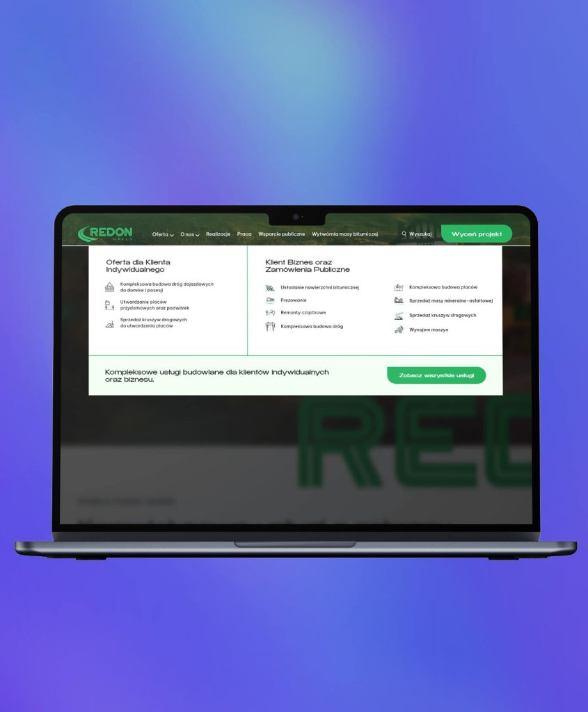 Tworząc nową stronę Redon, skupiliśmy się na potrzebach zarówno dużych inwestorów, jak i klientów indywidualnych. Postawiliśmy na jasny podział sekcji, intuicyjną nawigację oraz prezentację usług, które odpowiadają na konkretne wyzwania rynku budowlanego.
