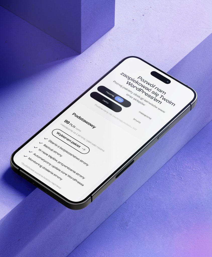 Podczas tworzenia strony WP Wise postawiliśmy na prostotę i czytelność, tak aby każdy – niezależnie od poziomu wiedzy technicznej – mógł szybko znaleźć interesujące go informacje. Architektura serwisu została zaprojektowana tak, by jasno prezentować różne pakiety opieki, usługi dodatkowe oraz korzyści płynące z regularnej aktualizacji i optymalizacji strony. Szczególną uwagę poświęciliśmy na wyeksponowanie najważniejszych cech oferty, takich jak bezpieczeństwo, regularne backupy czy szybkie wsparcie techniczne.